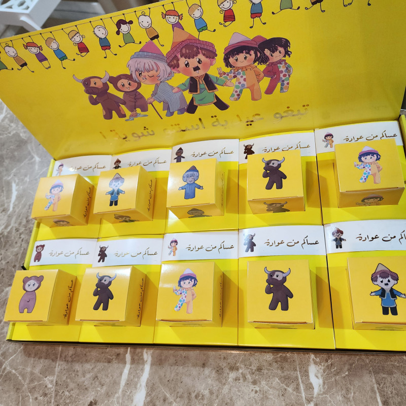 درزن صناديق لتوزيعات العيد بشخصيات كرتونية لطيفة مصنوعة من الورق المقوى بخلفية من الكرتون موضوعة على قاعدة بخلفية شخصيات كرتونية محببة للأطفال متوفرة بكميات محدودة.