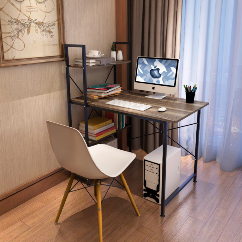 مكتب كمبيوتر مع ارفف جانبية حديث وبسيط بنمط عصري مصنوع من المعدن و اجود انواع الاخشاب متاح باللون الخشبي الغامق ومتوفر بمقاس , عرض 1متر × إرتفاع 1.39متر× عمق 48 سم و يمكن استخدامه في العديد من الاماكن و المهام