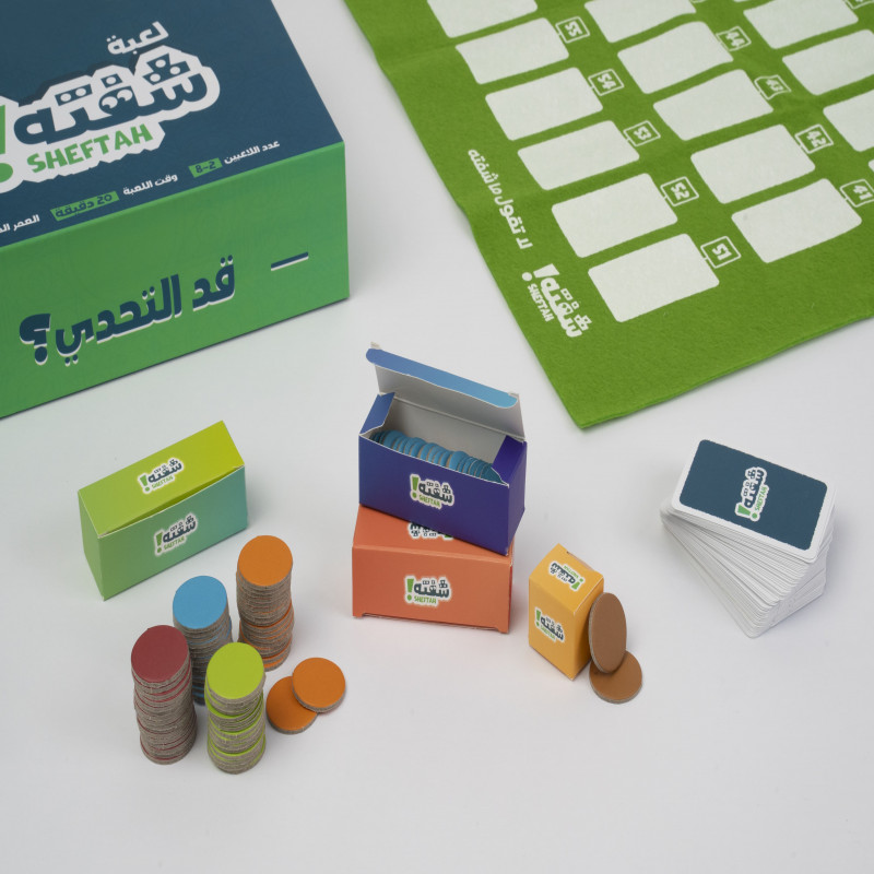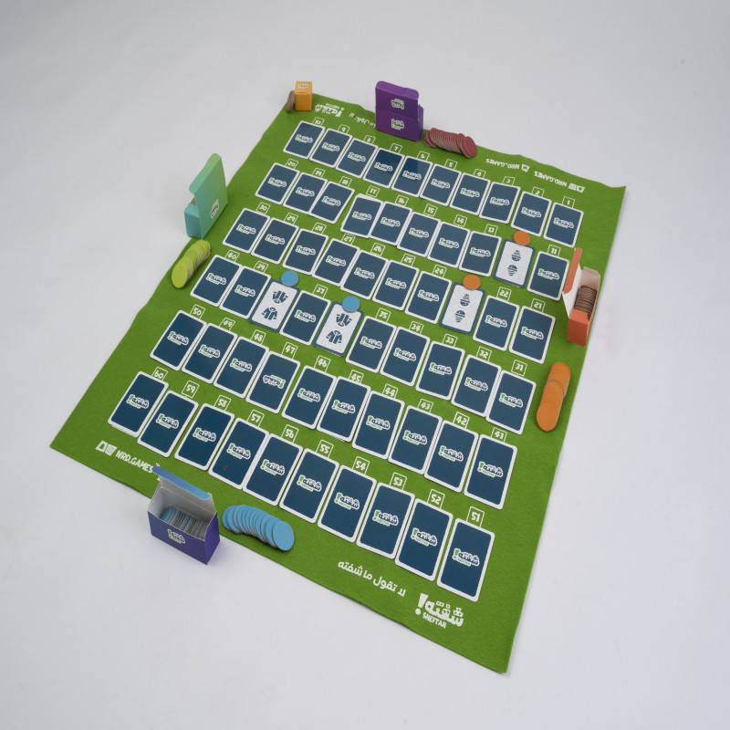 جهّزوا مضمار اللعب، واجتمعوا حول الفرشة ووزعوا الكروت عليكم عشوائياً حطّوا الكروت بأماكنها وهي مقلوبة وزّعوا الكراتين الصغيرة بينكم ( كل فريق لون ).