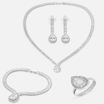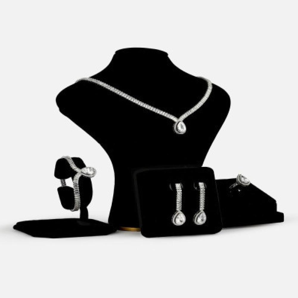 يتميز الطقم بتصميمه الذي يأتي بحلية على شكل دمعة تتزين بفصوص الزيركون اللامع, والذي يمكنك تنسيقة مع إطلالاتك المتنوعة لتحضي بإطلالة أنيقة و مميزة.