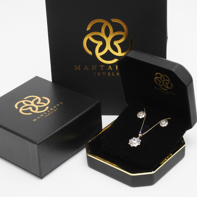 - قلادة وحلق أنيق مزين بأشعة الشمس ومرصع بالزركون النمساوي ومطلي بالذهب عيار 21 قيراط والسلسال مطلي بالذهب ايضا.