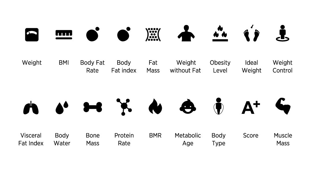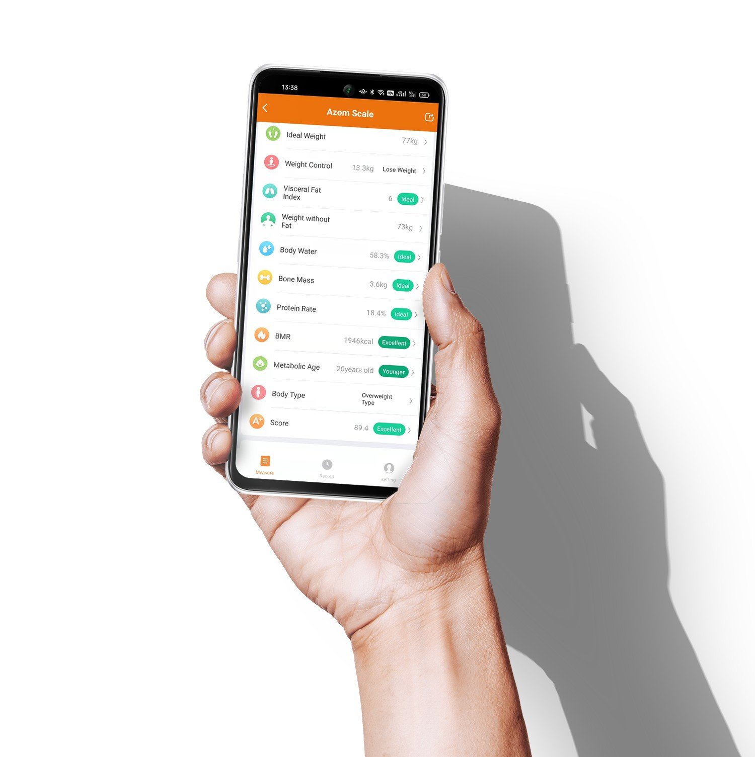 مع 18 قيمة مؤشر صحة للجسم، تستطيع التأكد من أنك متابع كل شي عن صحتك (مؤشر كتلة الجسم، الوزن، مؤشر الدهون الحشوية، المعدل الصحي العام، معدل البروتين، مستوى السمنة، الوزن بدون دهون، نوع الجسم، كتلة العضلات، العمر الأيضي، الوزن المثالي، كتلة الدهون، كتلة العظام، الماء في الجسم، التحكم في الوزن، معدل الدهون في الجسم، رقم دهون الجسم، BMR)